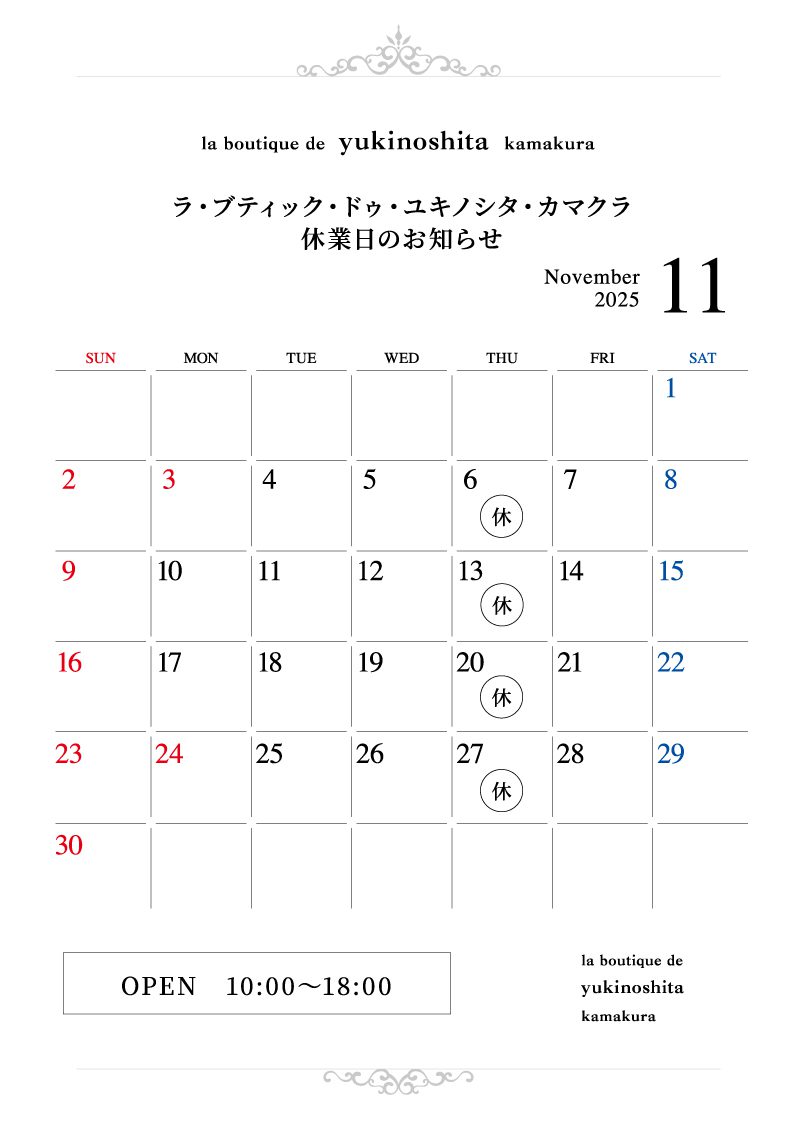 ラ・ブティック・ドゥ・ユキノシタ・カマクラ 11月定休日のお知らせ