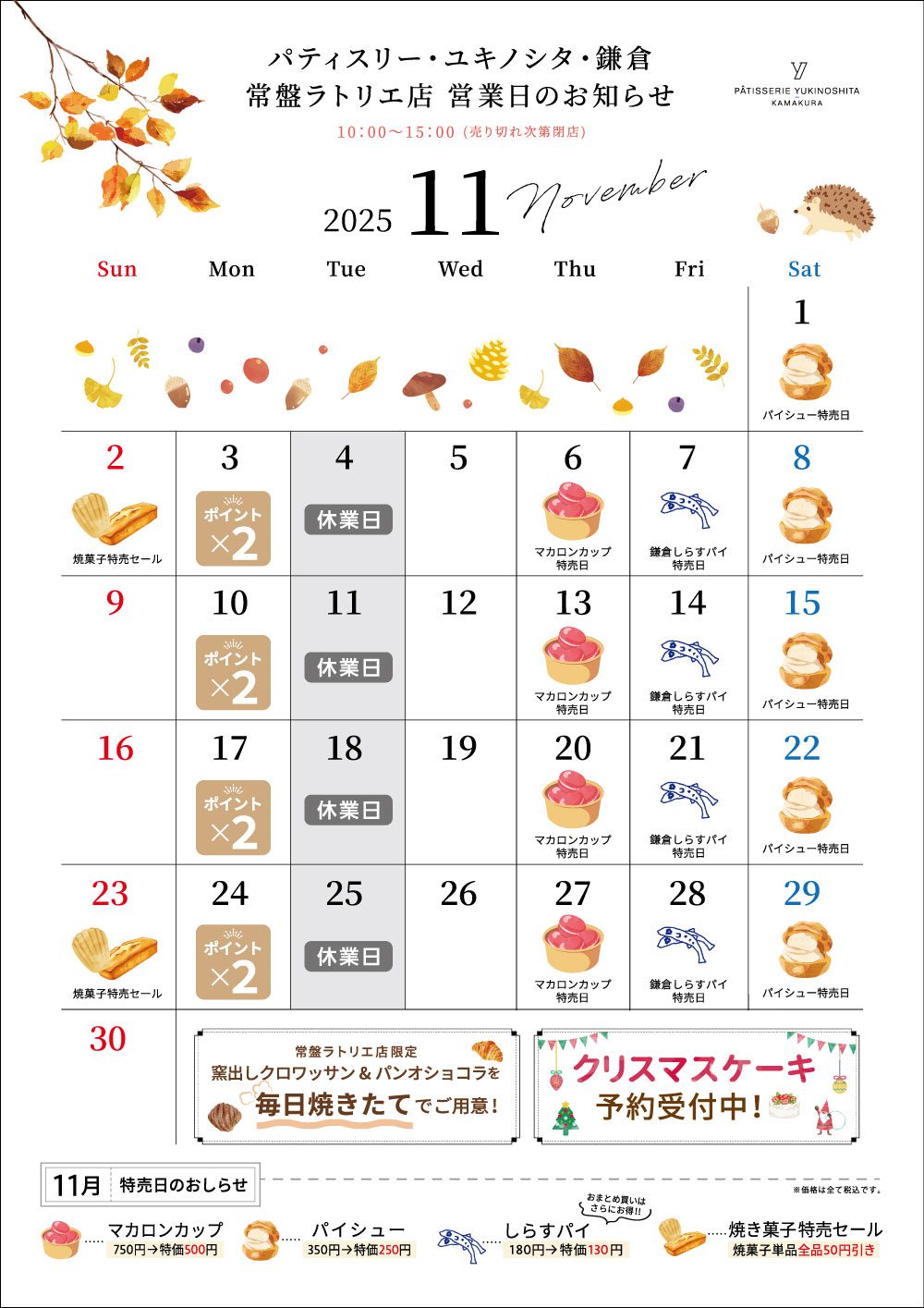 常盤ラトリエ店 11月営業日のお知らせ