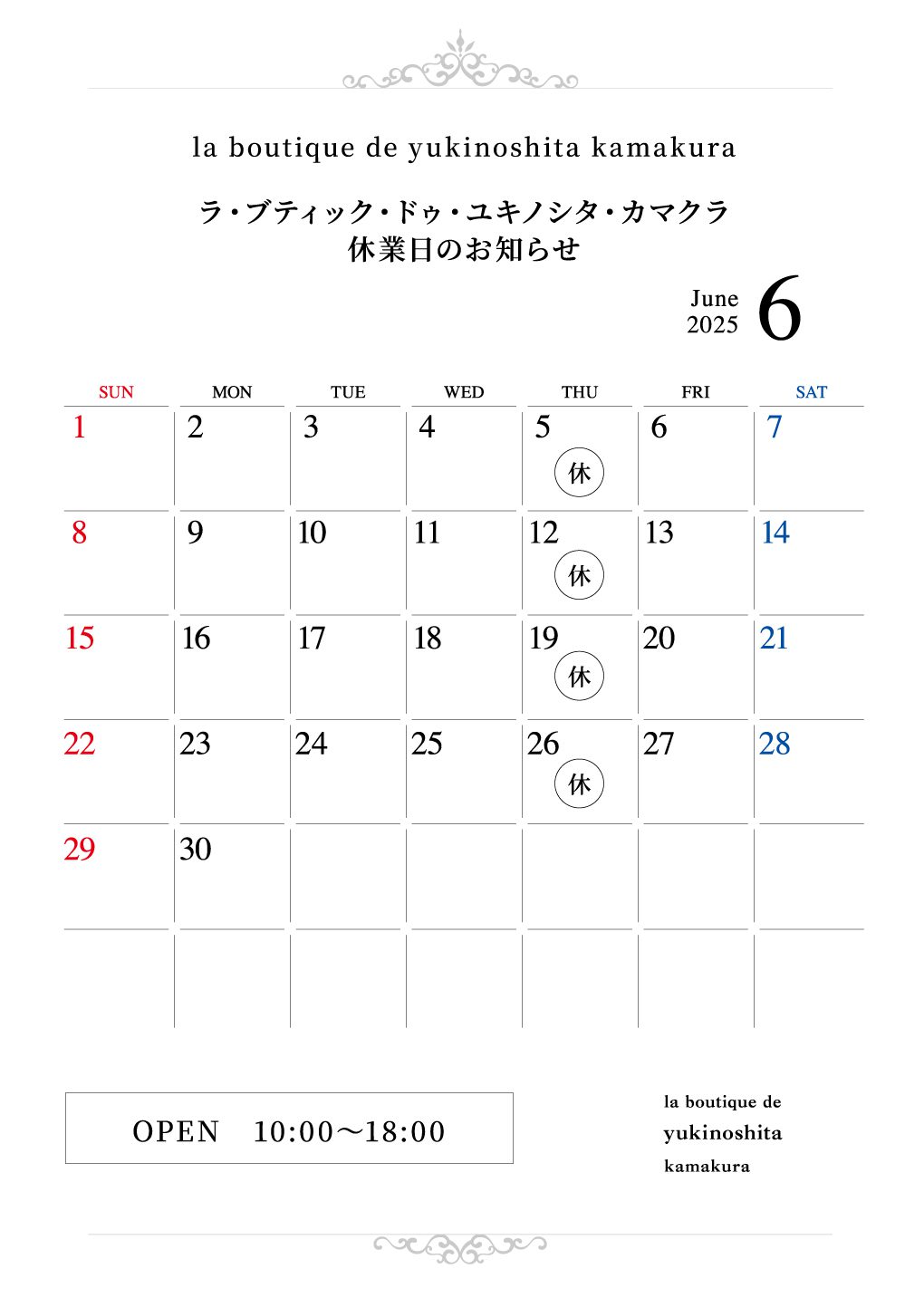 いつも la boutique de yukinoshita kamakura をご愛顧いただきましてありがとうございます。