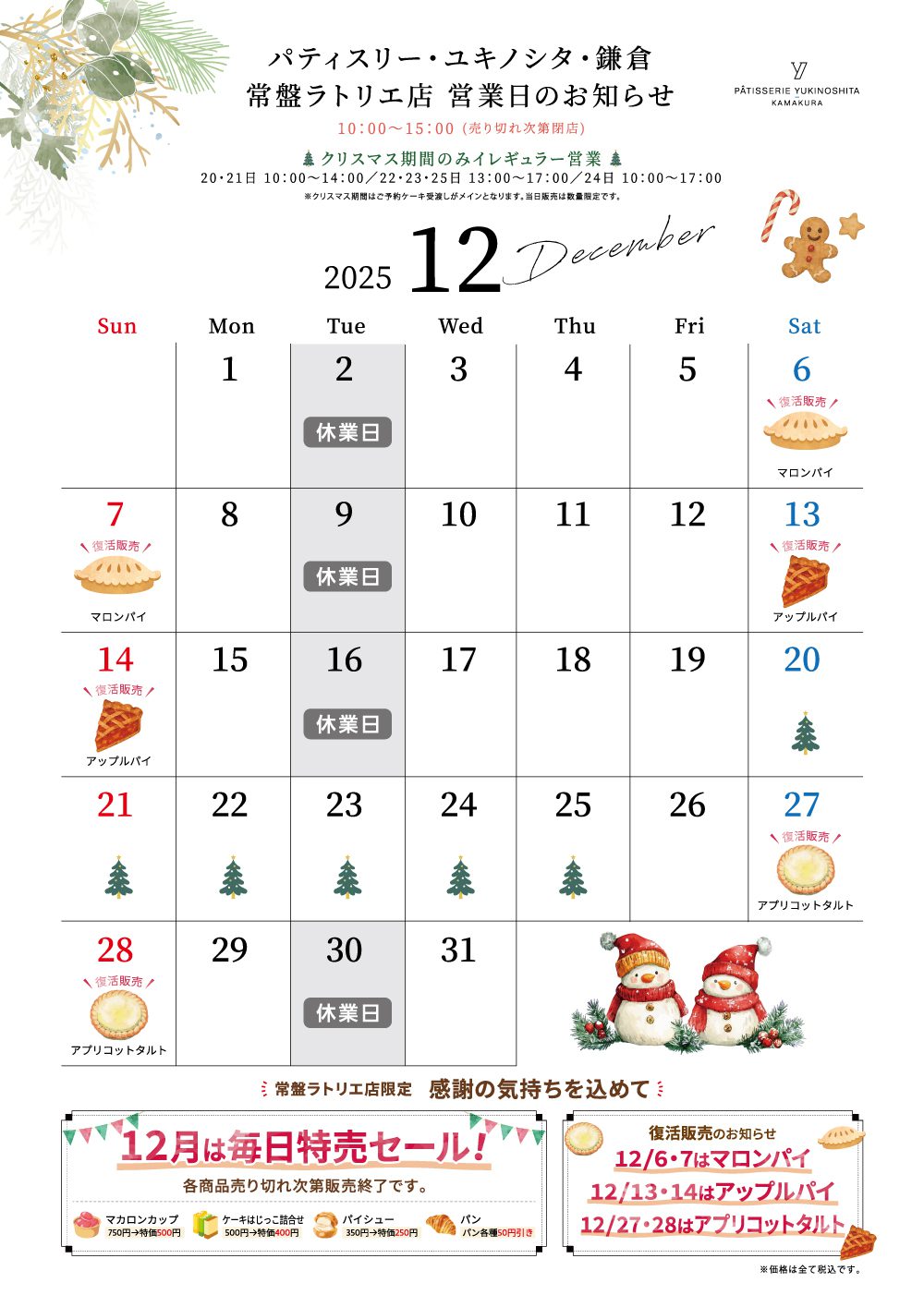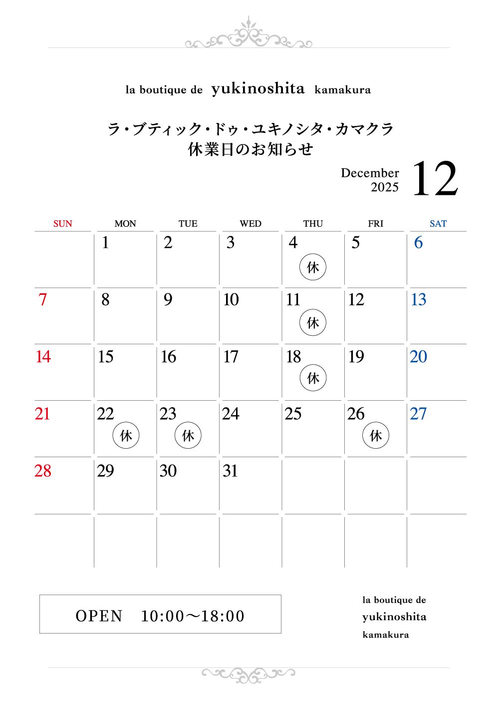 ラ・ブティック・ドゥ・ユキノシタ・カマクラ 12月定休日のお知らせ